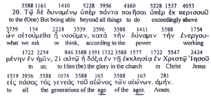 Direct Literal Translation - Concordant Bible vs 20 Now to Him Who is able to do super excessively above all that we are requesting or apprehending, according