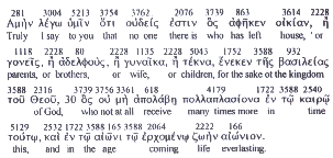 Direct Literal Translation - Concordant Bible Now He said to the, Verily, I am saying to you that there is no one who leaves house, or wife, or brothers, or parents, or children, on account of the kingdom of God, who may not by all means be getting back many fold in this era, and in the coming eon, life eonian.
