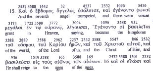 Versionvs 15 And the seventh angel sounded; and there were great voices in the heaven, saying, The kingdoms of this world are become (the kingdoms) of our Lord, and of his Christ; and he shall reign for ever and ever. Direct Literal Translation - Concordant Bible And the seventh messenger trumpets. And loud voices occurred in heaven, saying, The kingdom of this world became our Lord's and His Christ's, and He shall be reigning for the eons of the eons! Amen!